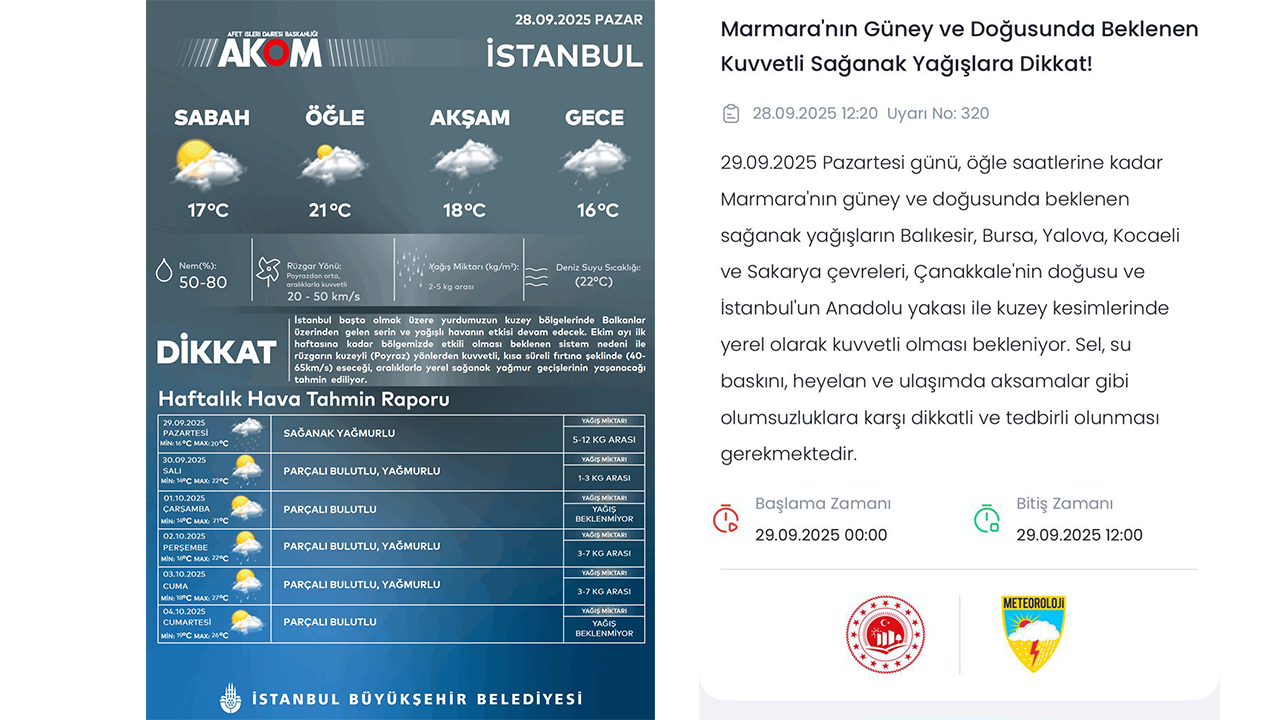 Türkiye’ye yeni hafta ile birlikte yağışlar da geliyor. Meteoloji telefonlara tedbir ve uyarı SMS’leri göndermeye başladı. AKOM duyurusunda İstanbul’un bu akşam başlayıp; pazartesi ve salıya kadar sürmesi beklenen yağışları işaret etti.