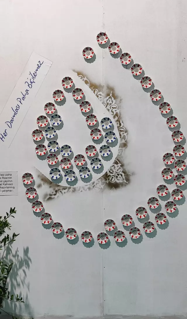 Kuraklık ve su kıtlığının etkilediği çay bitkisi, bu sanatsal çalışmanın merkezinde yer alıyor. Geleneksel kahveci bardağı ve tabaklarıyla oluşturulan “Su Damlası” figürü, Türk çayına dikkat çekmenin yanı sıra susuzluğun küresel önemini de vurguluyor.