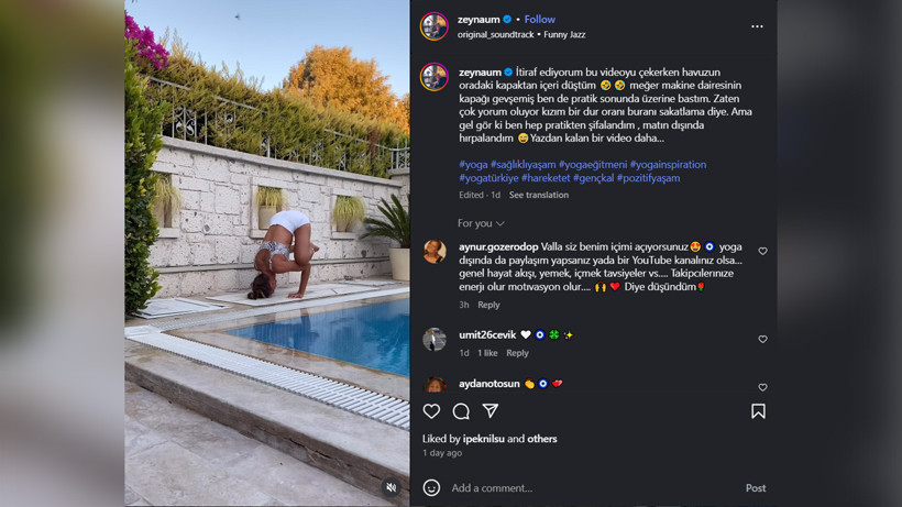 Instagram’da paylaştığı bir yoga videosunun arka planını anlatan 1998 Türkiye Güzeli Zeynep Tokuş, videoyu çekerken havuz başında kaza geçirdiğini itiraf etti.